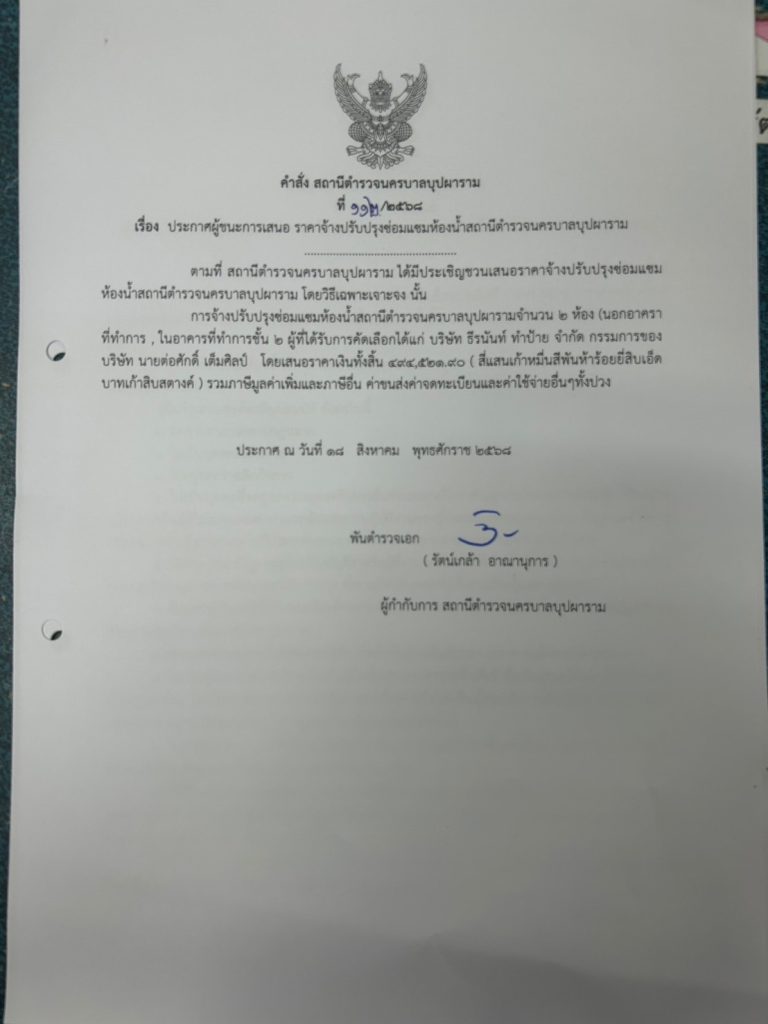 ประกาศเชิญชวนเสนอราคาจัดซื้อจัดจ้างปรับปรุงซ่อมแซมห้องน้ำสถานีตำรวจนครบาลบุปผาราม