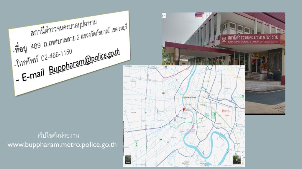 ข้อมูลการติดต่อ และ ช่องทางการรับฟังความคิดเห็น พันตำรวจเอกรัตน์เกล้า อาณานุการ ผู้กำกับการสถานีตำรวจนครบาลบุปผาราม เบอร์โทรติดต่อ 092-939-4414 สน.บุปผาราม ( คลิ๊ก )